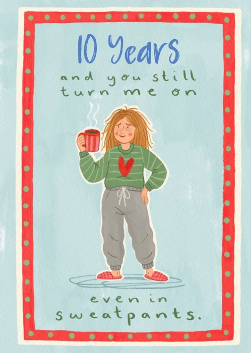 A bright, modern greeting card featuring hand-drawn typography and an illustration of a couple with a scalloped heart behind them. The design is finished with a spotted frame and a peach coloured edge.