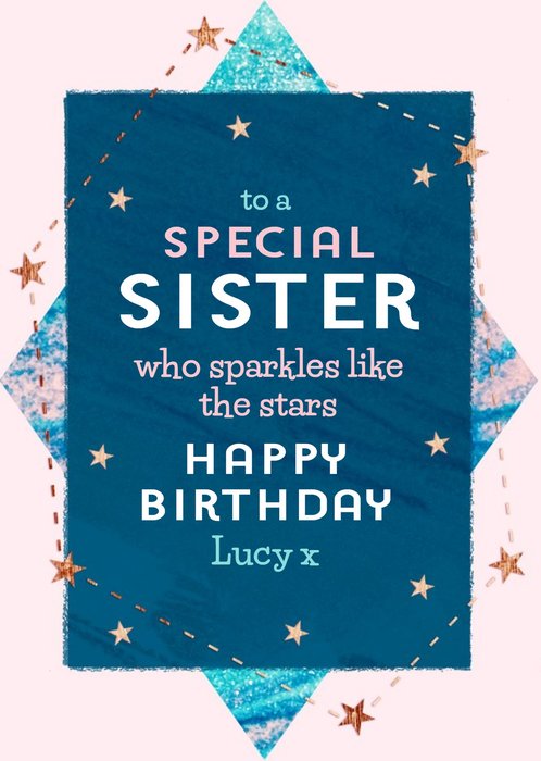 Front of card: Sister's Birthday Card Cosmos pattern with stars on a pink background. Text reads: "To a special sister who sparkles like the stars happy birthday Lucy x". All text can be personalised!