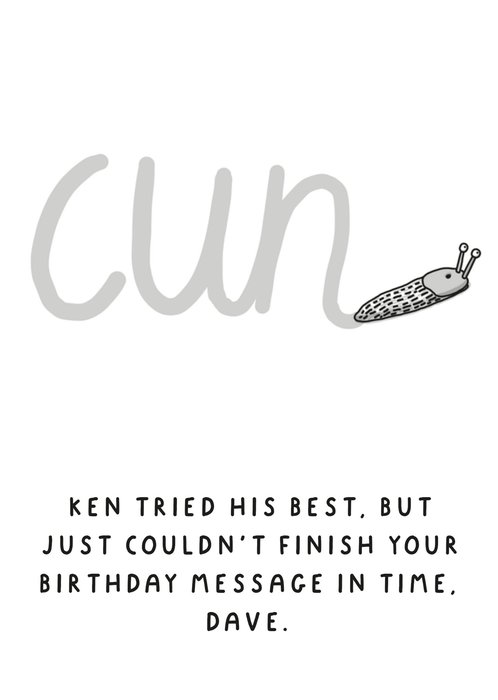 Front of card: Featuring an illustration of slug sliming the word cun. Text reads: