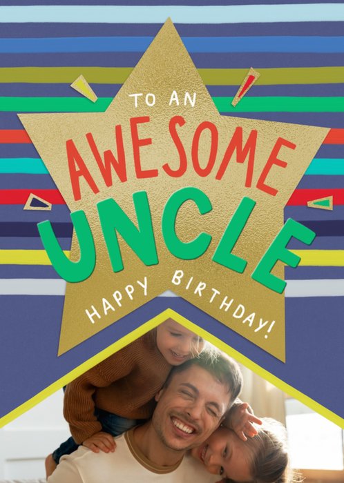 Featuring colourful, hand-painted effect typography with one photo upload frame that has a white starburst-shaped border. The card is adorned with decorative painted stripes in various colours against a dark blue background embellished by diagonal teal stripes. It’s a personalised card celebrating a cousin's 21st Birthday with enthusiasm and admiration.