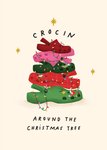 Front of card: Featuring an illustration of a pile of crocs in a Christmas tree shape decorated in lights, with black typography and gold stars on a cream background.