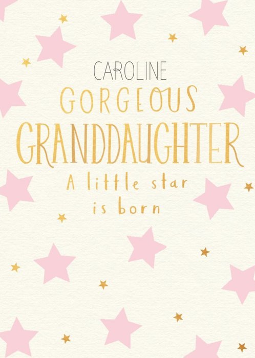 Front of card: Features a Pink starred patterned Illustration with text in the middle". Text Reads Caroline Gorgeous Granddaughter A Little Star Is Born Editable name.