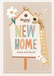 Front of card: Cute Boofle Bird House New Home Card Boofle climbing a ladder to an illustrated bird house.Text reads: "Happy New Home James And Sarah". James and Sarah are customisable.
