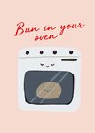 Features an illustration of an oven with a content smiling face against a pale pink background. Inside the over is a cute bun with a smiling face. At the top of the card is red, hand written style text.