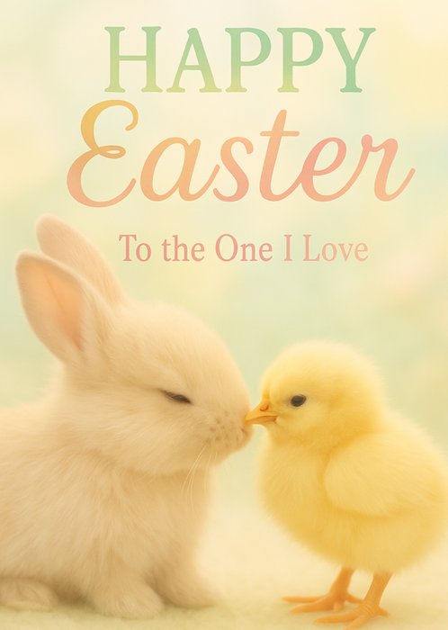 Featuring a soft-focus photo of a white bunny and a yellow chick touching noses. With pastel green and pink text above them.