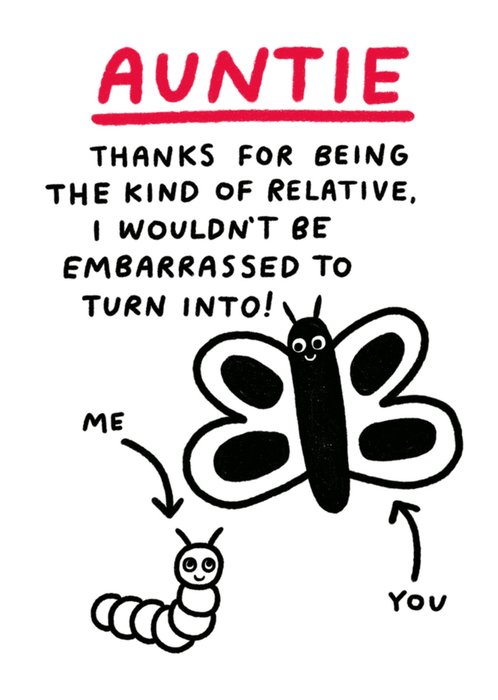 Text reads: "Auntie. Thanks for being the kind of relative, I wouldn't be embarrassed to turn into! Me. You."