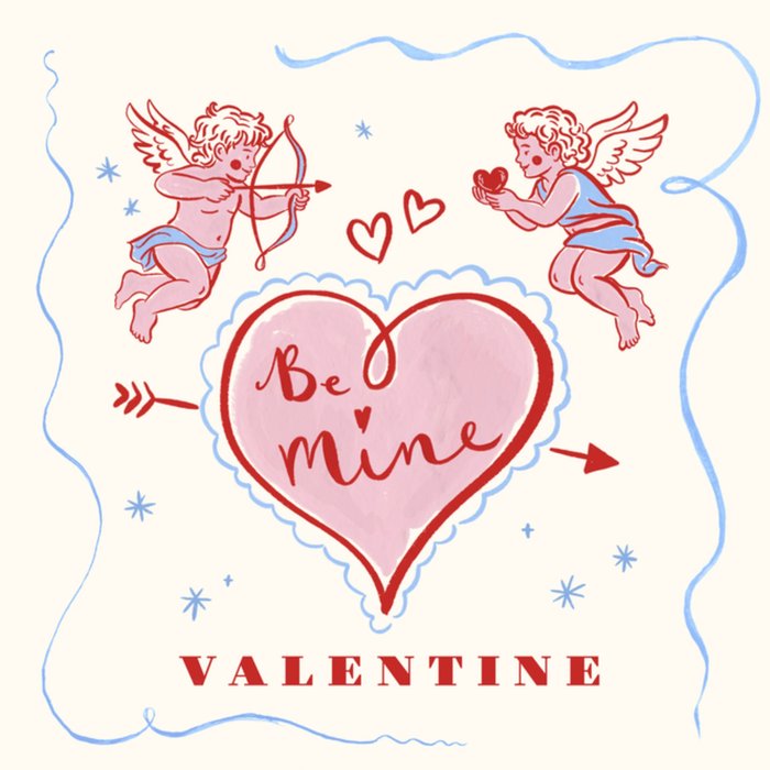 Featuring a retro style illustration of two cupids, one aiming a bow and the other holding a heart, above a large pink heart that has an arrow through it, and text inside it, on a cream background.