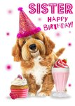 Cute Dog With Cupcake Sister Birthday Card