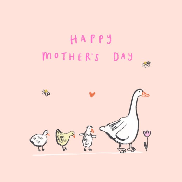 Featuring a mother duck walking with her three ducklings, small flowers and a heart, on a light pink coloured background.