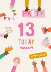 Front of Card: Colourful age and text on center of card on cream background surrounded by illustration of various hands holding banners, crown, cake and presents. Text reads: "13 TODAY MAISY!" With editable name