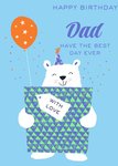 Front of card: Features an illustration of a Polar Bear holding a large gift with text above The text reads: "Happy Birthday Dad Have The Best Day Ever With Love." With editable recipient.