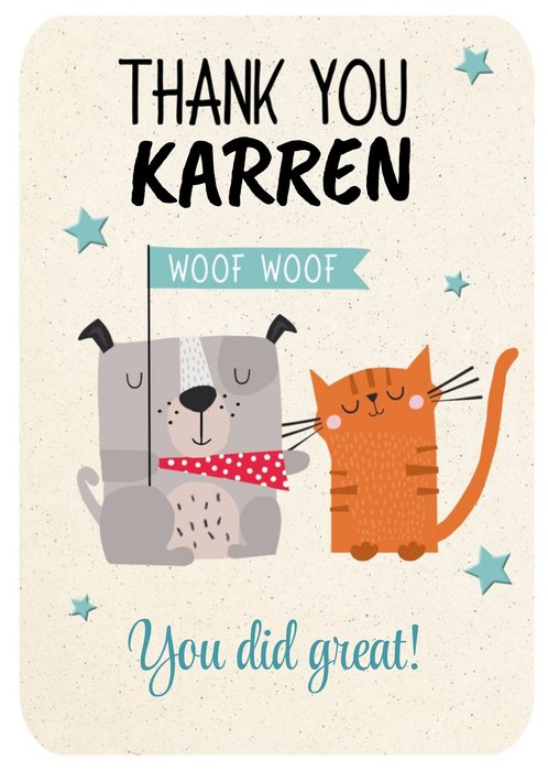 Front of card: Thank You Card Cute illustration of a cat and a dog surrounded by stars. Text reads: "Thank you Karren", "woof woof" and "you did great". 'Karren' and 'You did great' can be personalised!