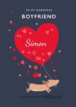 Front of card: 'Gorgeous Boyfriend' Valentine's Day Card Cute illustration of a dog running with a heart shaped balloon on a blue background. Text reads: "To my gorgeous boyfriend Simon". 'Simon' can be personalised!
