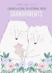 Front of card: Cute illustration of a Grandad, Grandma and Baby Bear surrounded by flowers and foliage. Congratulations message and editable name spaces above. Text reads:"Emma and Lucas. Congratulations on becoming proud grandparents.” With customisable names.