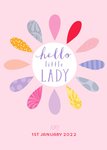 Front of card: Cute illustration of a large flower with each petal containing a different pattern. Large Hello Little Lady message in centre of flower and editable name and date of birth areas below. Text reads:"Hello Little Lady. Amy. 1st January 2022.” With customisable message, name and date of birth.