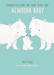 Front of card: Cute illustration of a Mummy, Daddy and Baby Bear. Congratulations message above and editable name and date of both spaces below. Text reads:"Congratulations on your teeny tiny newborn baby. Matthew. 1st January 2022.” With customisable name and date of birth.