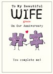 Cute illustration of two smiling jigsaw pieces, holding hands with a small red heart above them. Humorous anniversary message, some editable, above and below in black and red typewriter style type all on a cream background.