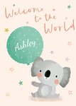 Front of card: Illustration of a cute koala holding a balloon with a name in it, surrounded by star confetti and text above. The design is gender neutral. Text reads: "Welcome to the World Ashley."