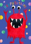 Featuring a cute bright red monster with big eyes & pointy teeth, on a blue background with colourful confetti polka dots & curved text.