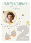 Features cute kawaii style illustrations of woodland creatures and objects like acorns, bugs and bees, with a photo upload area, text and a tree shaped like the number two.
