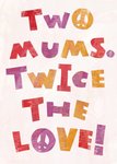 A fun and striking Mother's Day card featuring text written in bold letters with different colours and textures, making it look like a collage or a painting. The letters 'O' in the words 'two' and 'love' are replaced by peace symbols, adding a sense of harmony and unity to the message. The image conveys a positive and supportive attitude towards families with two mums.