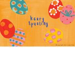 Featuring hand-painted colourful patterned Easter eggs surrounding chunky yellow lettering on a white background.