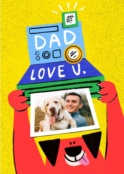 A cheerful greeting card showing a red cartoon dog holding up a framed photo and a fun camera-like gadget, all set against a bold yellow background with the message “Dad, love u.”