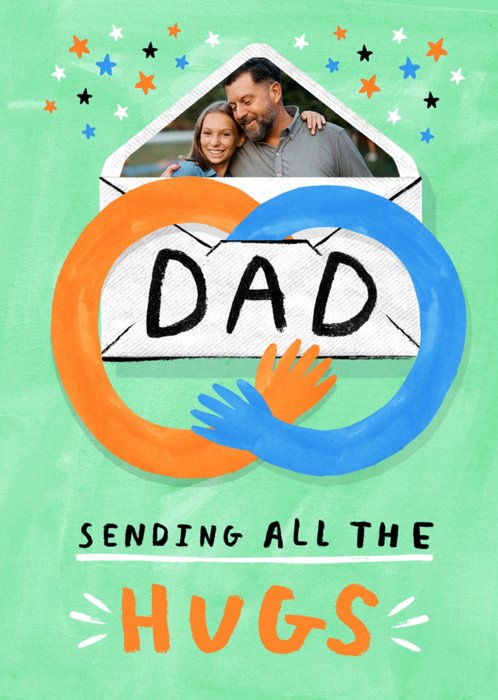 A warm and loving greeting card featuring an envelope bursting with a photo and the word “Dad,” hugged by bright orange and blue arms, all set on a mint green background with scattered stars and the phrase “Sending all the hugs.”