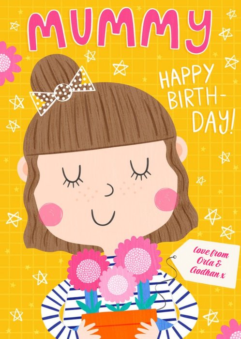 Front of card Cute Illustration of a Mum holding a Plant Pot on yellow background. Text says: Mummy Happy Birthday love from
