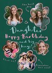 A modern design featuring five flower-shaped photo frames surrounded by pink doodled messages and a central handwritten birthday message on a dark green background.