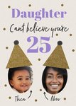 This greeting card design features a textured cream background decorated with scattered gold glitter dots. The text “Daughter Can’t believe you’re 25” is displayed prominently in purple serif and black cursive fonts. Two oval-shaped photo upload areas are located at the bottom, labelled “Then” and “Now,” with arrows pointing to each image. Both ovals are topped with glittery gold party hats adorned with black pom-poms.