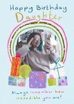 Featuring handwritten typography and a circular photo frame with several presents below.