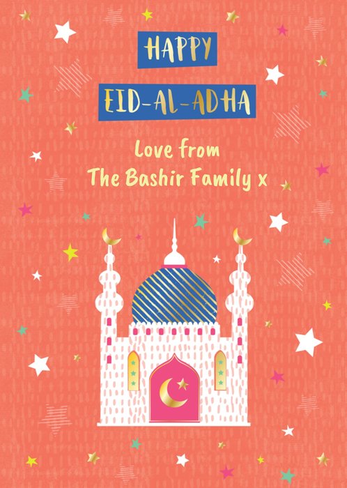 Front of card: Featuring an illustration of a mosque with stars scattered around in the background. Text reads: "Happy Eid al Adha love from The Bashir Family x."