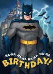 Front of card: Featuring a bold and vibrant illustration of Batman with bold white and yellow typography below in a wavy line, on a castle scene background with lightning and bats flying in the sky.