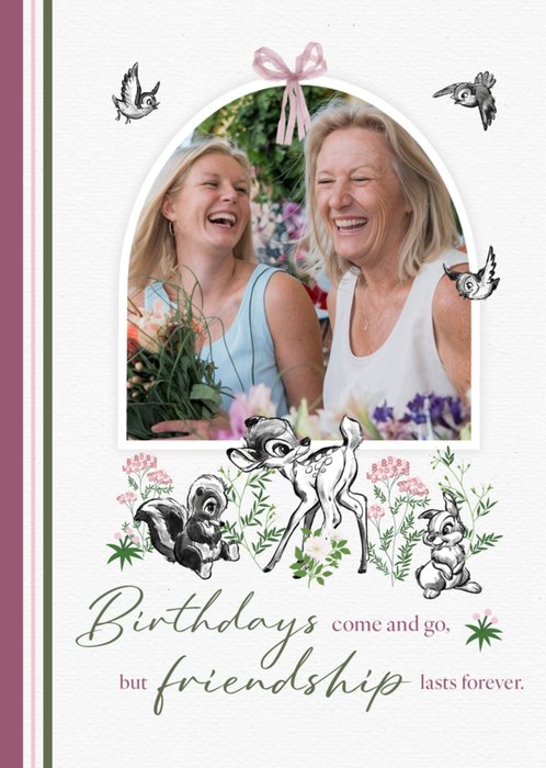 This Bambi greeting card design features Bambi, Thumper, and Flower illustrated in black and white among delicate floral elements, with the heartfelt message “Birthdays come and go, but friendship lasts forever,” adorned with a pink ribbon at the top for an elegant and nostalgic touch.