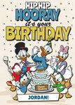 Front of card: Featuring an illustration of Donald Duck, Daisy Duck, Scrooge McDuck, Huey, Dewey, and Louie. Text reads: "Hip hip hooray it's your birthday Jordan!. 'Jordan!' can be personalised!