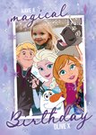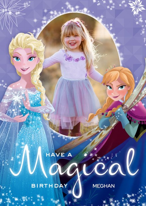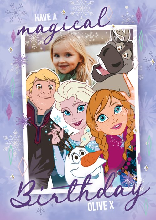 Featuring an illustrated Frozen scene with Sven, Olaf, Kristof, Anna and Elsa in front of a photo upload frame, with text above and below, and snowflakes on a purple background.