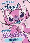 Featuring Angel smiling brightly against a pink background with sparkly star-like accents. Fun, colourful typography makes the card playful and sweet.
