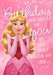 A cheerful greeting card with Disney’s Aurora smiling brightly in a glittering pink gown, surrounded by sparkles and heartfelt birthday wishes on a vibrant pink background.
