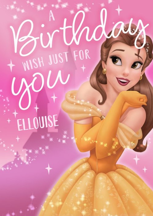 A magical greeting card featuring Disney’s Belle in a sparkling golden gown, smiling sweetly beneath the words "A birthday wish just for you" on a pink starry background.