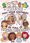 A delightful and cute Photo Upload Birthday card designed for a niece featuring a soft pink background, adorned with whimsical white cloud-like shapes. Encircling the edges is a delightful array of cartoon Disney princesses and other friendly Disney characters. In the centre there are two photo upload areas, one is a cloud-shaped frame and the other is a heart-shaped frame. The entire composition is sprinkled with stars and sparkles, creating a magical and celebratory atmosphere..