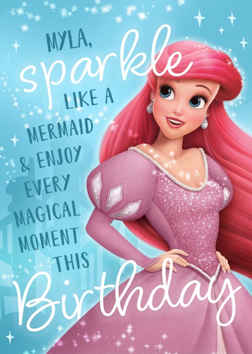 A sparkling greeting card featuring Disney’s Ariel in a glittery pink gown, smiling brightly under twinkling stars and birthday wishes on a light blue background.