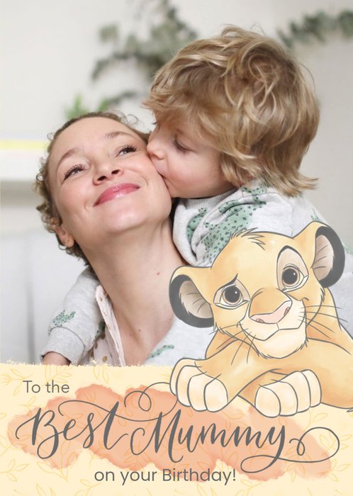 Front of card: Disney The Lion King Photo Upload Birthday Card Featuring Simba and Nala. Text reads: "Happy birthday lovely Mummy every day with you is such a treat we love you lots". 'Mummy' and 'we love you' can be personalised!