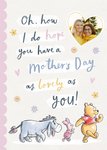 A beautifully illustrated Disney Winnie the Pooh Mother’s Day card featuring Pooh, Piglet, and Eeyore in a classic hand-drawn style. With a heart-shaped photo frame and a warm, whimsical message, this card captures the magic of friendship and love. Soft pastel tones, floral details, and button embellishments create a charming and nostalgic design—perfect for making Mum feel extra special.