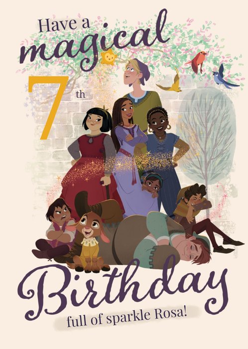 Front of card: Featuring illustrations of characters from Disney's Wish. Text reads: "Have a magical 7th birthday full of sparkle Rosa!". '7th' and 'full of sparkle Rosa!' can be personalised!