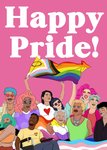 An inclusive, joyful illustration of a diverse group of people celebrating Pride together on a bright pink background. They are waving the Progress Pride Flag and the Transgender Flag, with characters of varying ethnicities, genders, ages, and abilities. The design promotes acceptance, unity, and celebration of the LGBTQ+ community.