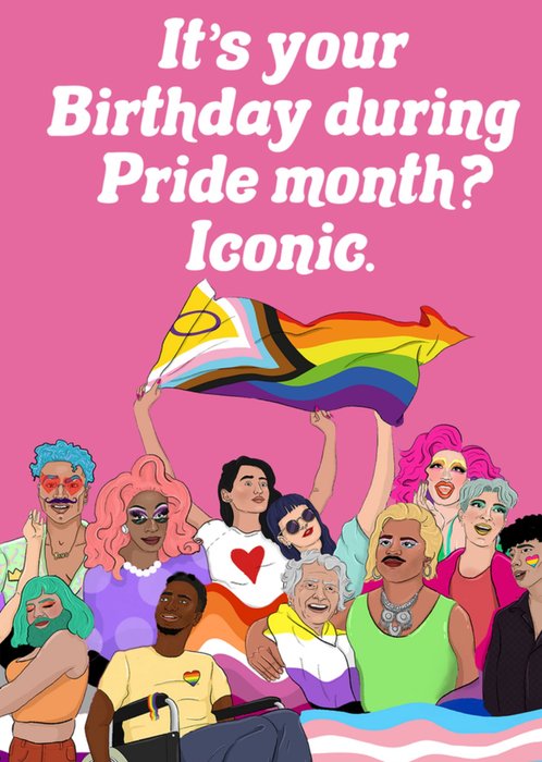 An inclusive, joyful illustration of a diverse group of people celebrating Pride together on a bright pink background. They are waving the Progress Pride Flag and the Transgender Flag, with characters of varying ethnicities, genders, ages, and abilities, including a wheelchair user. The design promotes acceptance, unity, and celebration of the LGBTQ+ community.