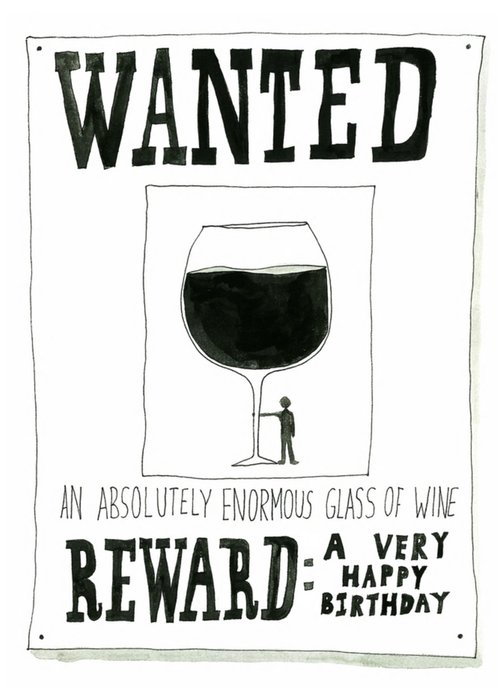 Text reads: "Wanted: An absolutely enormous glass of wine. Reward: A very happy Birthday."