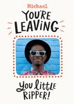 Front of card: Illustrated red dots around a photo upload frame on a cream background. Text reads: "Michael, You're Leaving. You little ripper!". Editable name.