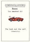 Front of card: Retro style illustration of a driver in a red open top sports car with black typewriter style text above and below on a cream background with editable name. Text reads:"Congratulations! Reece. You smashed it! The test, not the car! (thankfully)" With customisable name.